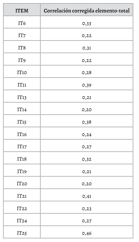 En la Tabla 1, se observa que el coeficiente de correlación ítem-test de cada uno de los ítems del cuestionario, presenta una correlación positiva, obteniéndose correlaciones superiores a 0,20 (Frías-Navarro, 2019), el cual presenta las estimaciones de la confiabilidad como consistencia interna. Por tanto, la escala en su integridad muestra una adecuada consistencia interna (Soler-Cárdenas, 2012).