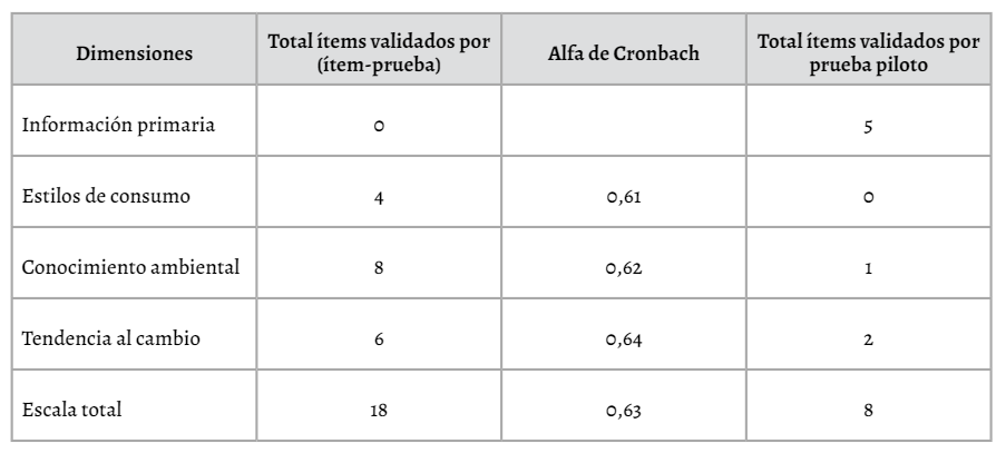 Se optó por utilizar un cuestionario semiestructurado de 26 preguntas distribuidas en cuatro dimensiones según las preferencias de consumo de los usuarios comprendidos básicamente por: información primaria del consumidor, estilos de consumo, conocimiento ambiental y tendencia al cambio, a todo ello se acompañó la observación directa de los patrones de consumo de los ciudadanos. El cuestionario de la encuesta, antes de su aplicación a la muestra seleccionada, fue validado con un grupo de 10 participantes elegidos al azar (prueba piloto) con la intención de corregir posibles errores de consistencia. El contenido de las preguntas del cuestionario referente a la información y a las preguntas tipo abiertas fueron evaluadas para su viabilidad mediante una simple prueba piloto: IT1, IT2, IT3, IT4, IT5, IT12, IT23 e IT26. Finalmente, para las demás preguntas se utilizó el análisis de fiabilidad o repetibilidad por el método de las mitades que consiste en obtener el coeficiente de la correlación de cada uno de los ítems o elementos planteados en el estudio.
