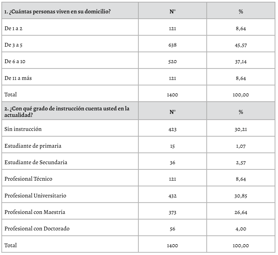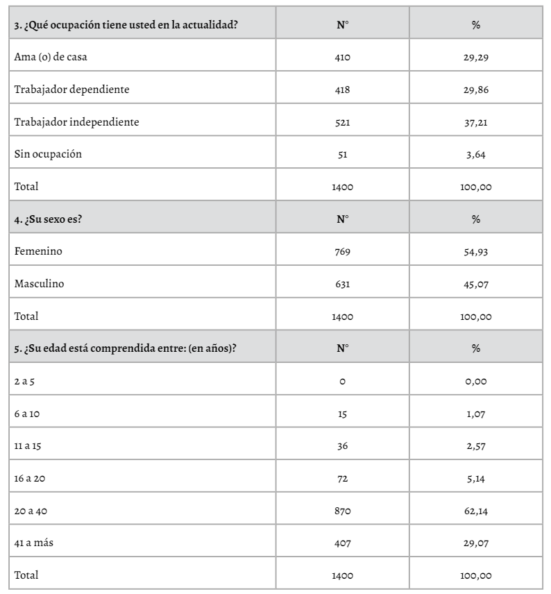 En la tabla 3, se muestra los resultados de la dimensión de información primaria, donde del total de encuestados, se puede observar que predominantemente, cada familia se encuentra compuesta de tres a cinco integrantes en un mismo hogar, los cuales son potenciales consumidores de bolsas de plástico de un solo uso. En relación al grado de instrucción, podemos mencionar que los encuestados representan mayoritariamente a profesionales con grado universitario y profesional con maestría. Sin embargo, una cantidad no menor de encuestados corresponde a personas sin ningún grado de instrucción, obteniendo de esta manera percepciones amplias sobre la problemática planteada. La ocupación de los evaluados prevalece en trabajadores independientes, un dato no menos importante es el total de personas evaluadas cuya ocupación es ama(o) de casa que representan 29%, esto nos permite evaluar la dinámica de compras de las personas independientemente de su ocupación (Derraik, 2002), prevaleciendo el sexo femenino (55%).