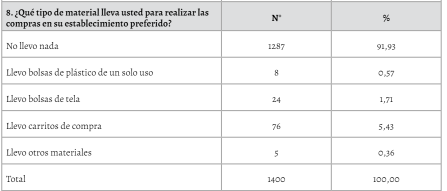 Esta tendencia de compra nos muestra que 55% de los encuestados acude por lo menos una vez a la semana a hacer compras, mientras que 44% lo hace por lo menos dos veces a la semana lo que nos indica la frecuencia de compras realizadas en los establecimientos cuya fuente primaria es la emisión de bolsas de plásticos de un solo uso (Mangizvo, 2012). En España, el 38,0% de los evaluados acuden entre 6 y 10 veces al mes (Carlos et al., 2012). Los evaluados al ser consultados sobre los materiales que llevan para realizar las compras en su establecimiento preferido, 92% no llevan ningún material para realizar sus compras, es decir acuden libres de elemento “manos vacías”” para realizar sus compras, a cambio reciben bolsas de plásticos de un solo uso para transportar lo comprado, el cual queda demostrado con un 99% del total de la muestra (Purca y Henostroza, 2017).