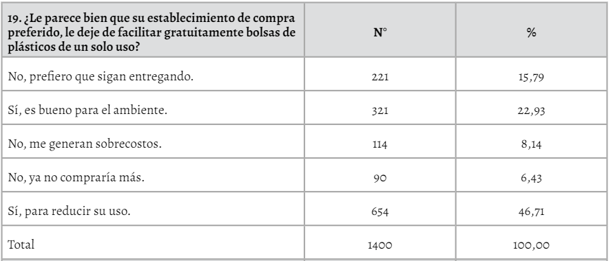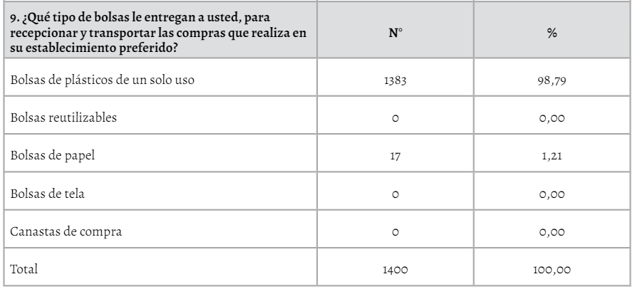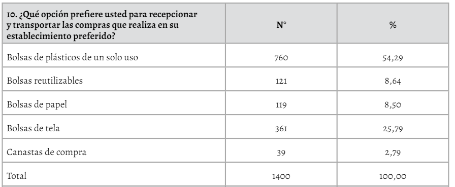 Se concluye sobre los estilos de consumo, que los encuestados realizan sus compras en mercados minoristas y en supermercados, acudiendo de una a dos veces por semana, y reciben bolsas de plástico de estos establecimientos. Referente al conocimiento ambiental, prefieren bolsas de plástico para trasladar sus compras por no tener costo. Referente al impacto ambiental, mencionan que no cuentan con otra opción, recibiendo de seis a 10 bolsas por compra que son dispuestas para la eliminación de la basura. Para la tendencia al cambio, prefieren que se entreguen bolsas reutilizables. Finalmente, se requieren políticas para orientar a los consumidores al uso de bolsas de plástico de un solo uso.