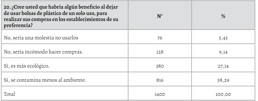 En la tabla 6, se muestran los resultados referentes a la dimensión de tendencia al cambio, se muestran datos alentadores sobre todo debido a la predisposición con las que cuentan a los cambios de estilos de consumo rutinario en las compras que realizan, al consultarles sobre si les parecería correcto que su establecimiento de compra preferido, les deje de facilitar gratuitamente bolsas de plásticos de un solo uso (Martinho et al., 2017), 47% de los encuestados se encuentra a favor de esta medida donde mencionan que primordialmente tendría impacto en la reducción de la contaminación (Camann et al., 2011; Martinho et al., 2017; Rose, 2020; Van Rensburg et al., 2020). 23% de los encuestados considera que esta medida, sería muy buena para el ambiente ya que ecológicamente estarían comprometidos con la minimización de estos residuos contaminantes (Connolly & Prothero, 2003; Rensburg et al., 2020). Solo un 20% opina que prefiere que este tipo de bolsas se sigan facilitando sin repercusión económica sobre el consumidor (Starovoytova et al., 2016).